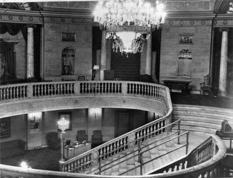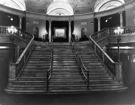 The building was a true architectural gem of Ottawa, designed in the neoclassical Adam style. It featured three large Palladian windows above the main entrance and marquee, overlooking Bank Street. The theatre’s main doors were massive, crafted from oak. Visitors entering the theatre first stepped into a spacious vestibule adorned with towering columns and high mirrors. The lighting in the vestibule was provided by crystal wall sconces. The ticket booth was embellished with bronze and ivory details. The theatre’s foyer had a unique geometric ceiling design, illuminated by a massive central chandelier. A grand marble staircase led to the ballroom mezzanine level. On both sides of the staircase were entrances for the orchestra. Above the stairs, on the mezzanine level, there were separate rooms for writing, a ladies’ lounge, and a smoking room painted in “Pompeian green.” Luxurious leather armchairs and sofas complemented the theatre’s grand interior. The walls of the Capitol Theatre were decorated with tapestries, frescoes, and ornate niches. The floor was covered with an antique floral-patterned carpet. In the audience hall, an elaborately adorned proscenium arch framed the theatre’s main stage. For guests’ comfort, fresh air circulated continuously through large air ducts installed beneath the seats.